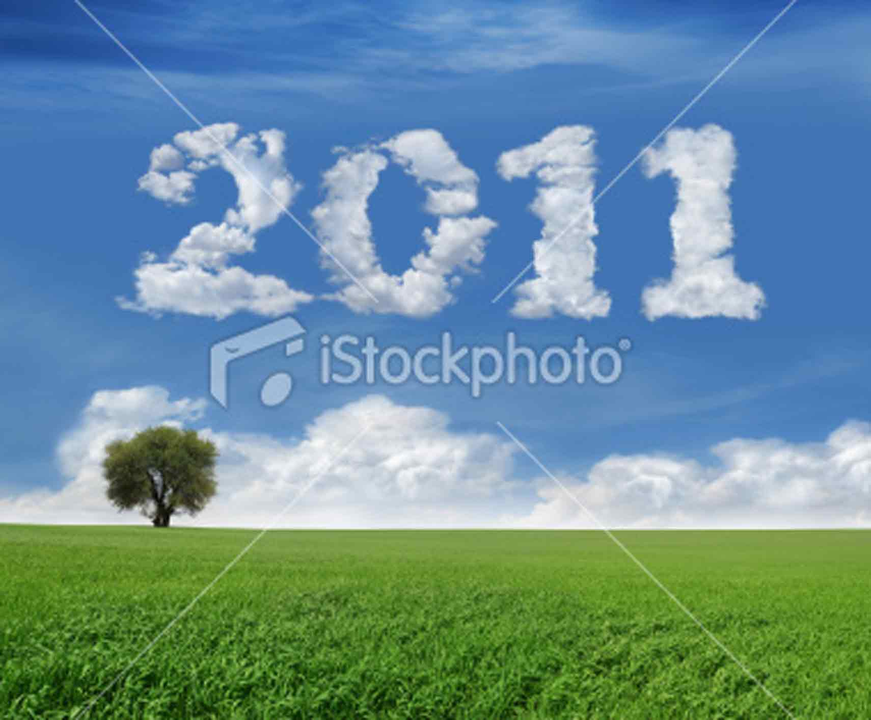 Lonely tree and green field landscape with clouds in the shape of "2011".