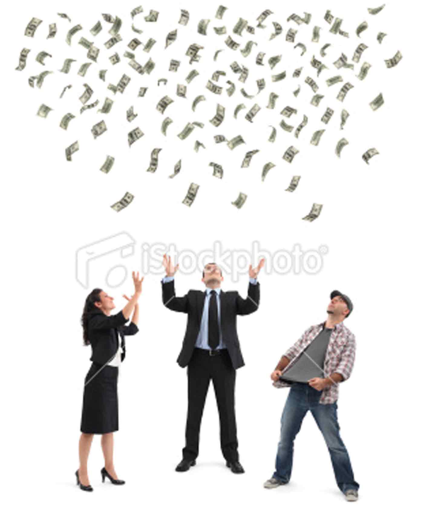 Three person are under the money rain (one hundred-dollar bills) to catch the falling money. Isolated on white background.