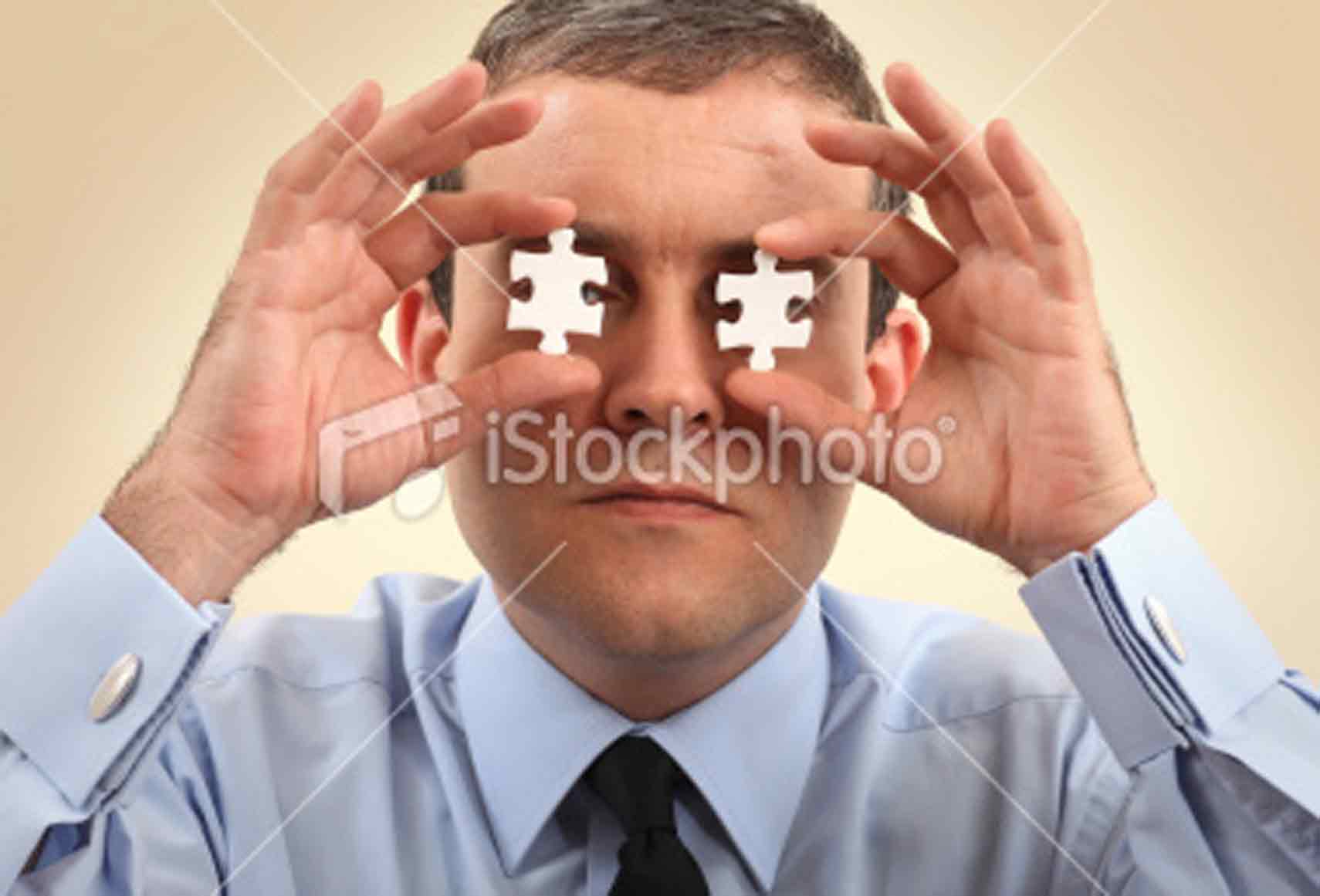 A businessman who puts the jigsaw puzzle pieces on his eyes.