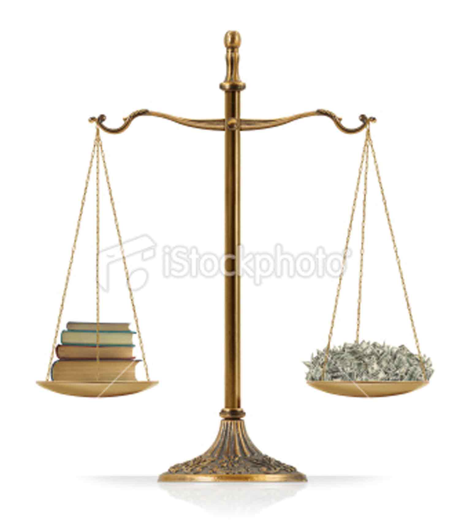 "Knowledge is power" / "valuable information" concept: There are old books at the one side of "Scales of Justice" while there is money on the other side. Books and money are equal weighted. Isolated on white background.